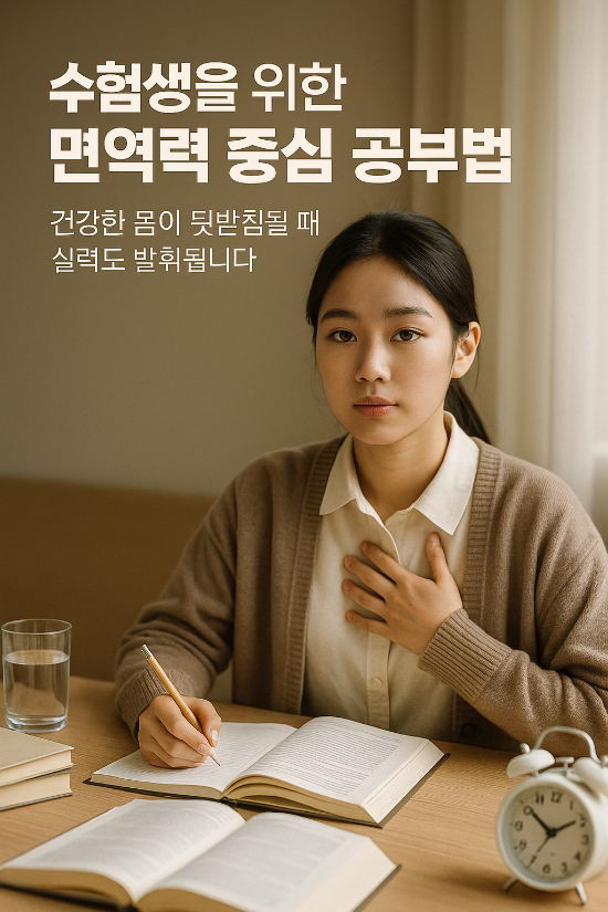 수험생에게 면역력은 학습 능력만큼이나 중요한 요소입니다. 올바른 식사, 충분한 수면, 건강한 감정 관리가 뒷받침되어야 실력도 제대로 발휘할 수 있습니다. 감기 한 번, 피로 누적 한 번이 수개월의 준비를 무너뜨릴 수 있습니다.