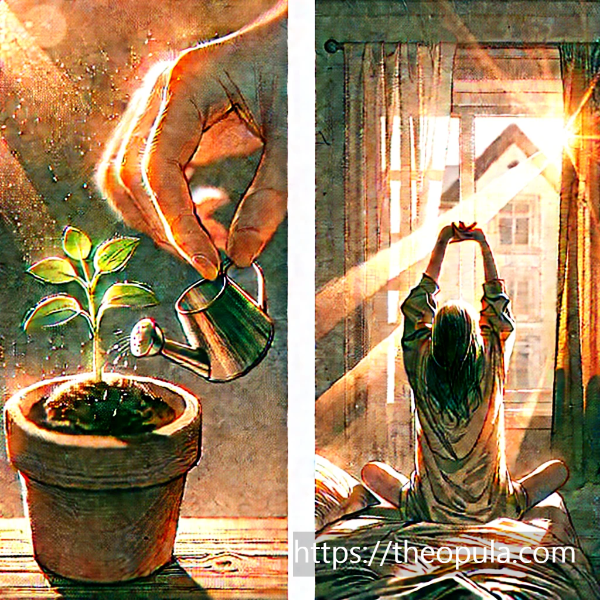 - 5분 햇볕 쬐기: 현관문만 열고 나가 5분만이라도 햇살을 느껴보세요. 햇볕은 비타민D를 합성해 우리 기분을 좋게 만드는 가장 강력한 천연 항우울제입니다.