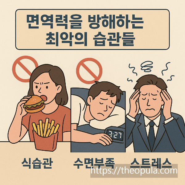 면역력저하, 나쁜 생활습관, 건강을 망치는 습관, 수면부족, 스트레스관리, 잘못된 식습관, 면역력관리, 건강한 습관, 생활면역, 만성스트레스, 식습관개선, 건강수면습관, 면역력회복, 건강정보, 하루건강관리