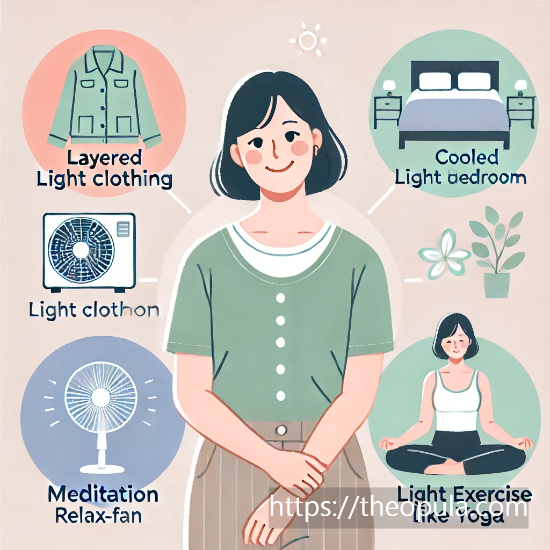 - 옷차림 조절: 얇은 옷을 겹쳐 입어 갑작스러운 열감에 쉽게 벗고 입을 수 있게 하세요.